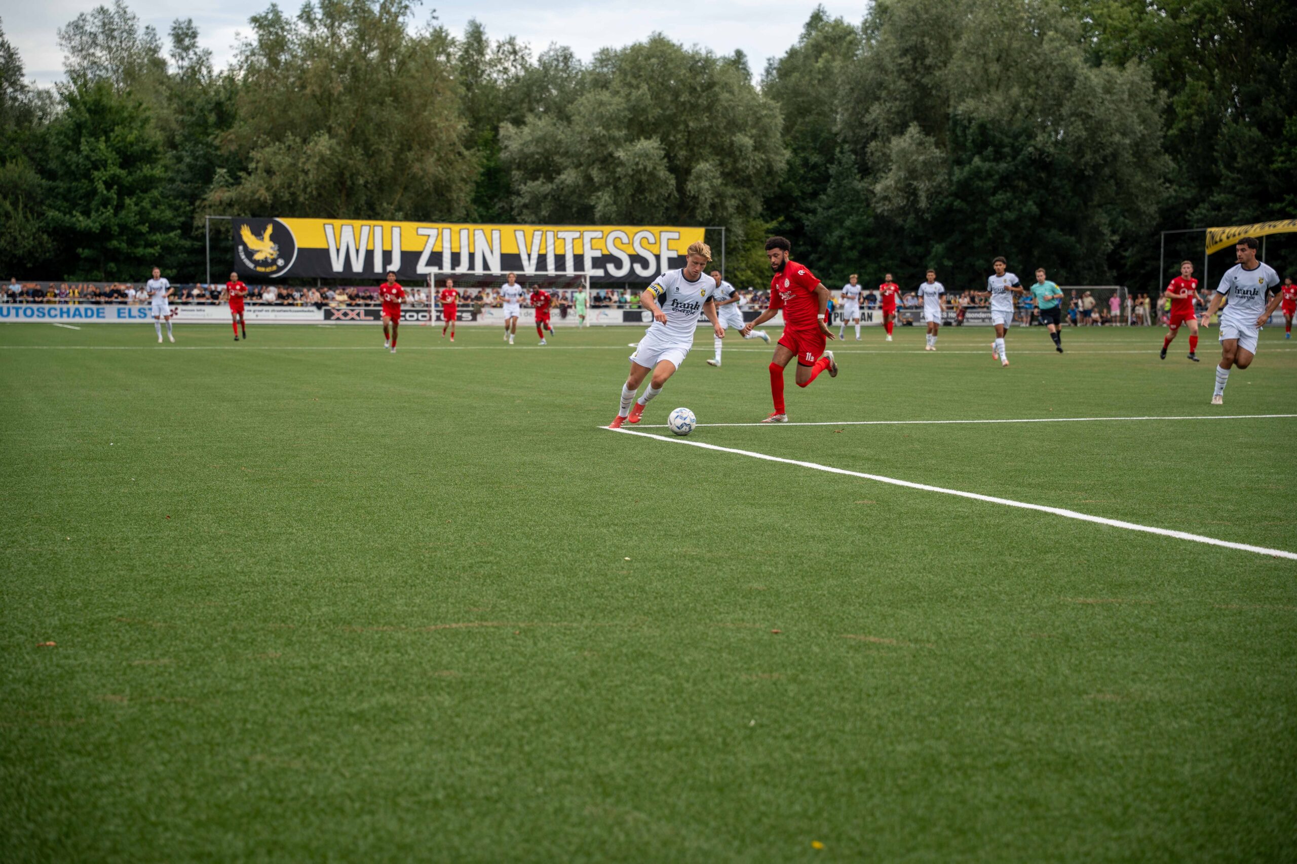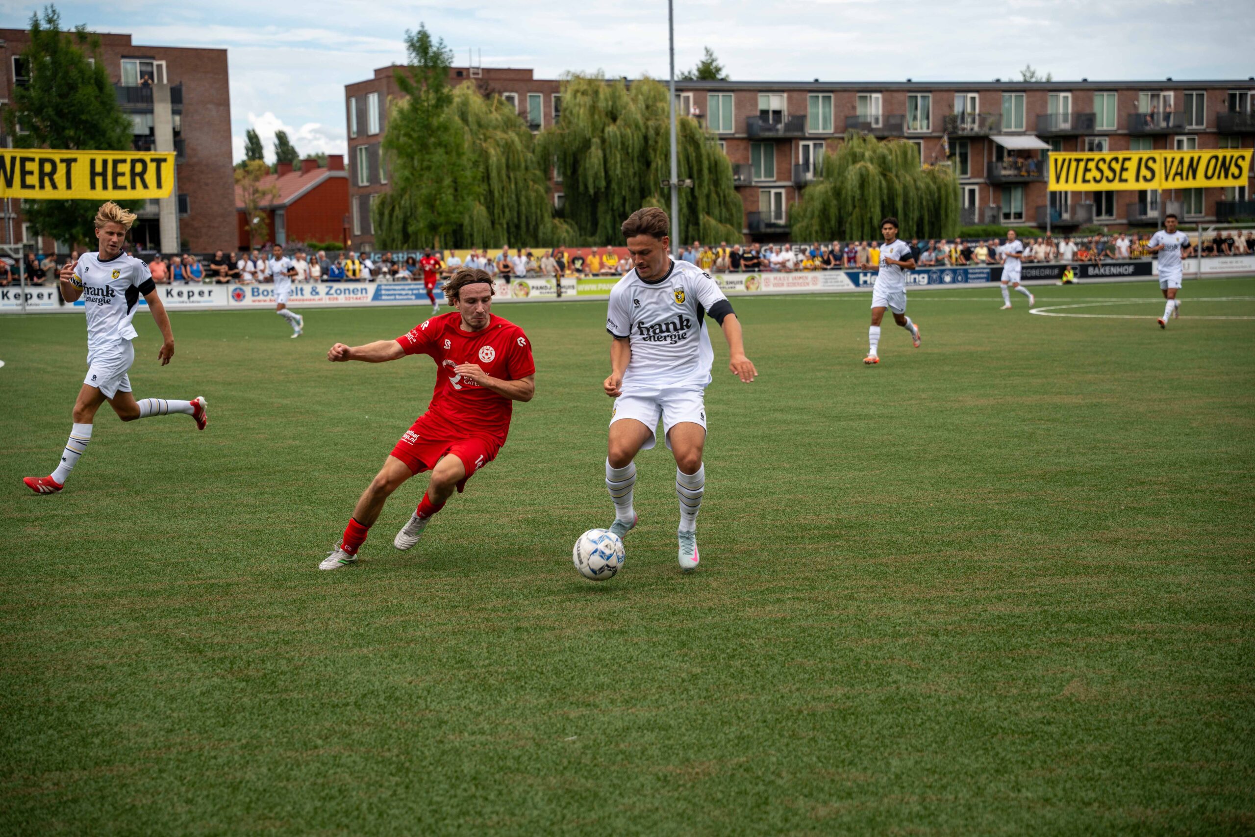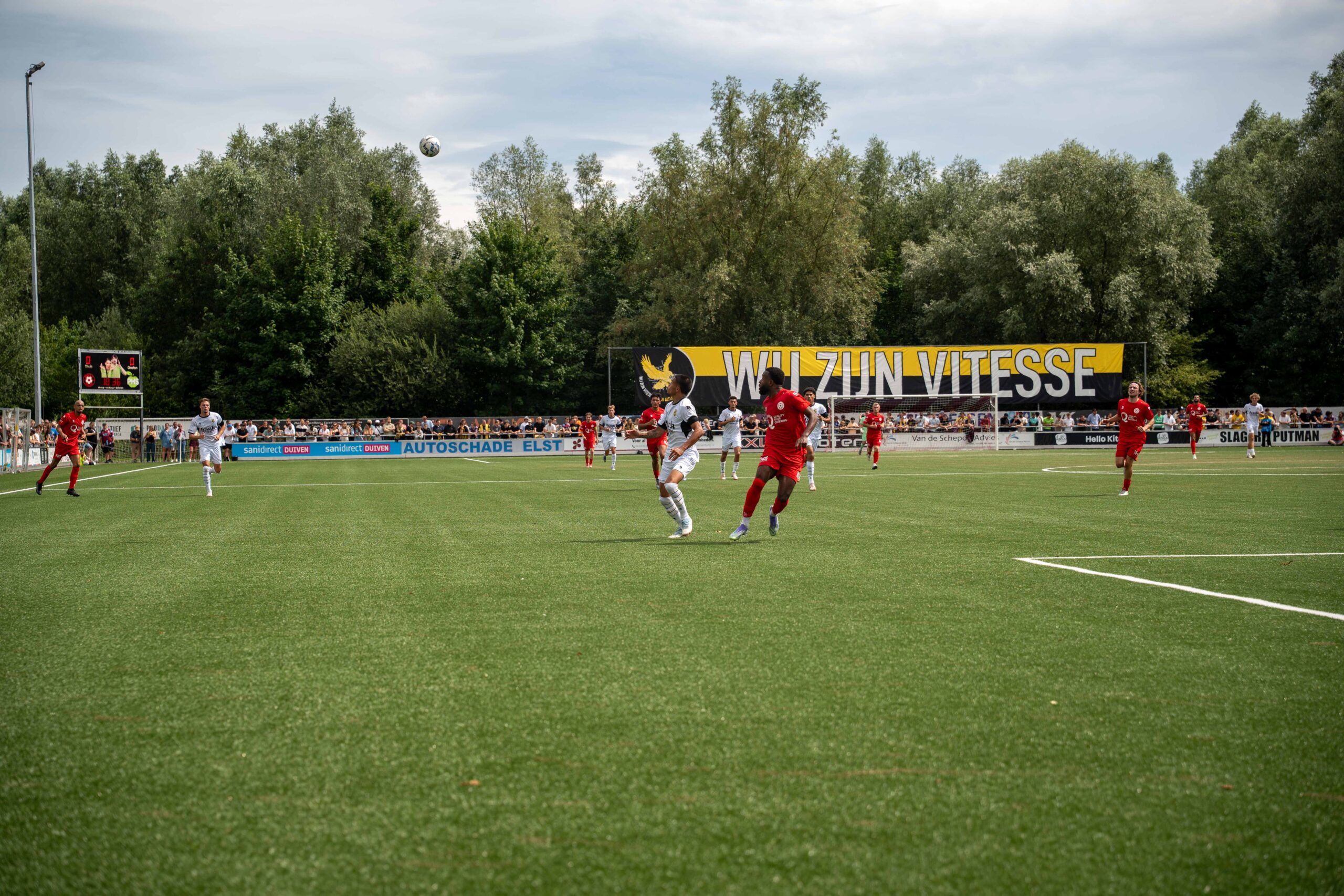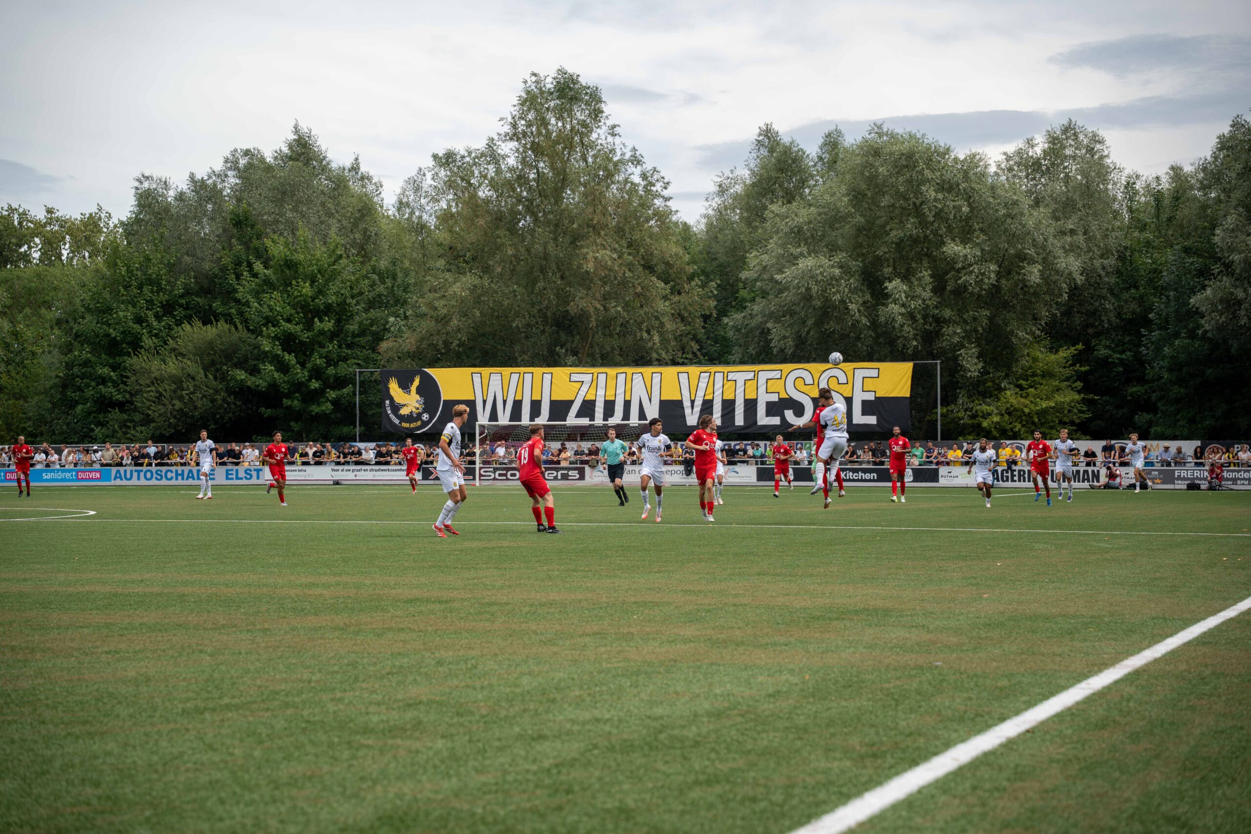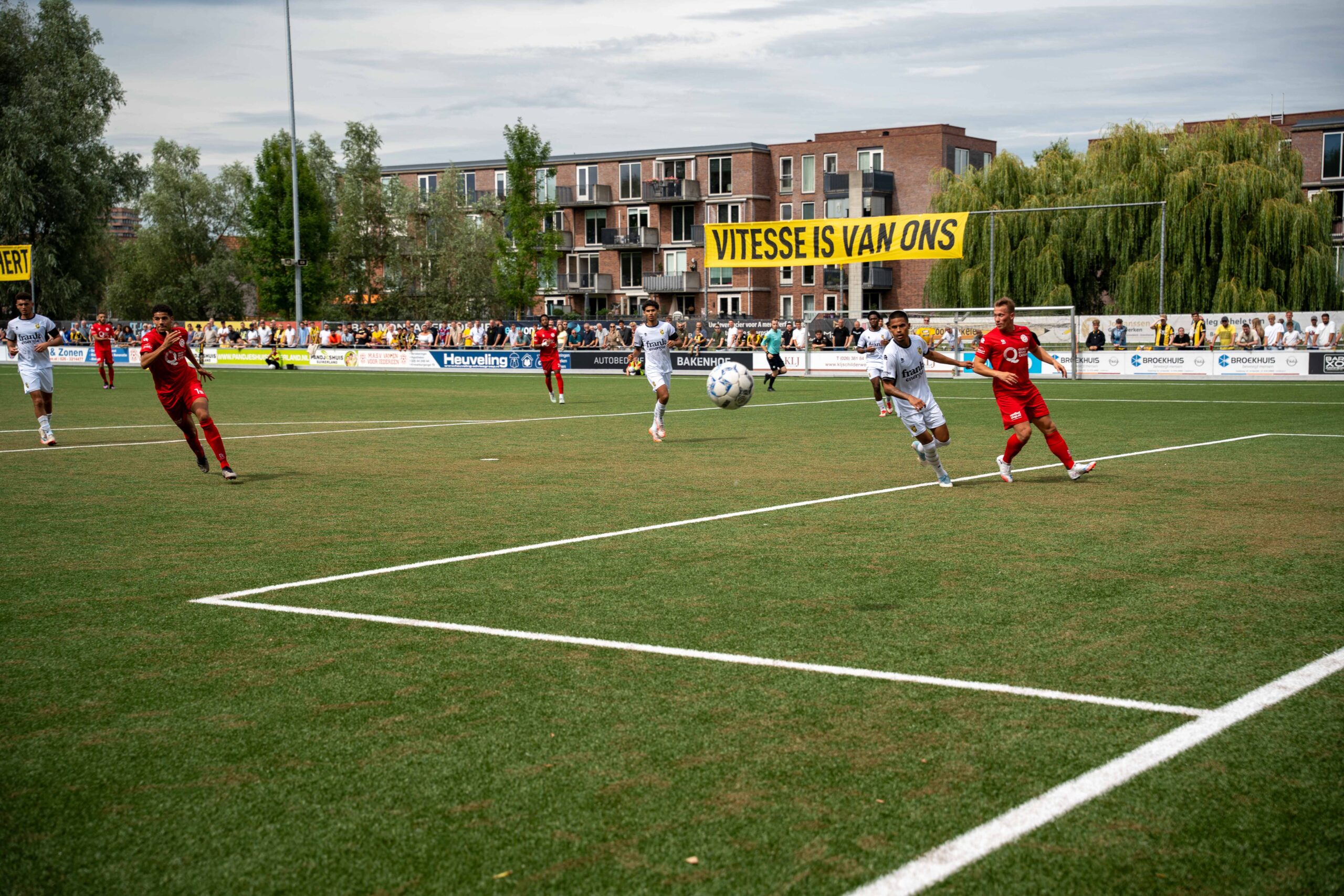 Het oefenduel tussen MASV en Vitesse stond zondagmiddag op Sportpark Malburgen-West volledig in het teken van de supportersactie om Vitesse te behouden voor het betaalde voetbal. Voor een uitverkochte accommodatie met 1500 toeschouwers speelde de profclub een serieuze wedstrijd tegen de Arnhemse amateurs, die het eerste half uur goed weerstand boden.